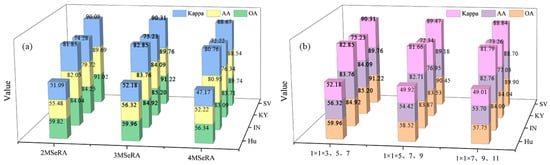 The number of densely connected units in the MSeRA structure proposed in this article impacts classification accuracy. Therefore, we selected two, three, and four MSeRA modules to determine the optimal number. The experimental results are shown in Figure 7a. In the KY, Hu, IN, and SV datasets, the OA, AA, and Kappa values obtained with 2 and 4 MSeRA modules are lower than those obtained with three modules. From this, it is evident that using three MSeRA blocks more effectively extracts spectral features from hyperspectral images and achieves the best classification results.