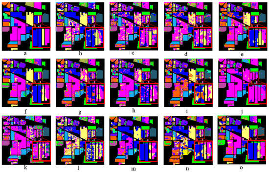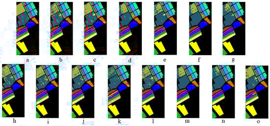 - Indian Pines (IN) dataset: This dataset was collected using the AVIRIS sensor in the Indian Pines region of northwest India in 1992. The image has spatial dimensions of 145 × 145, consists of 220 bands, and covers a wavelength range of 200–400 nm. The spectral and spatial resolutions are 10 nm and 20 m, respectively. Excluding background pixels, there are 10,249 spatial pixels used for experiments. There are 16 types of ground objects, primarily crops and vegetation, with a small number of buildings and other objects. Detailed information is provided in Figure 6. Due to the unavailability of 20 bands, the experiment only utilizes the remaining 200 bands out of the total 220 for research. There is a noticeable imbalance in the number of samples among different classes. The average training pixels account for 11.59% of labeled pixels.
