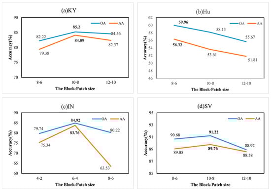 Effects of the block-patch size on OA and AA (%): (a) KY, (b) Hu, (c) IN, and (d) SV.