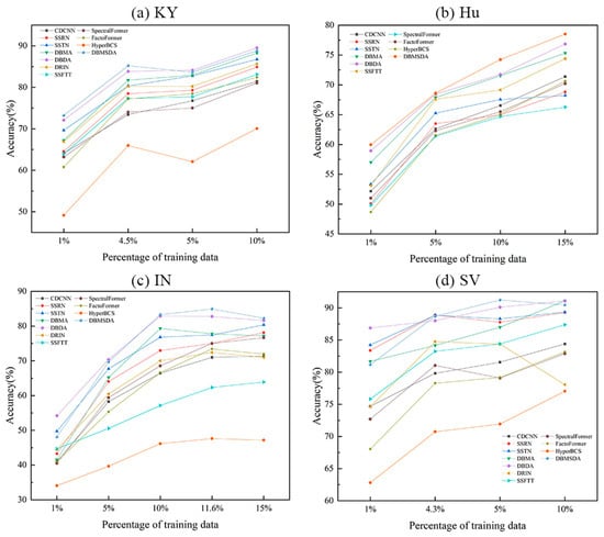 The network’s performance is significantly influenced by the quantity of labeled training pixels; generally, as the number of labeled training pixels increases, so does the accuracy of network training. For the KY, Hu, IN, and SV datasets, we selected various labeled training pixel counts for comparative analysis. The selected training pixel ratios are as follows: 1%, 4.5%, 5%, and 10% for the KY dataset; 1%, 5%, 10%, and 15% for the Hu dataset; 1%, 5%, 10%, 11.6%, and 15% for the IN dataset; and 1%, 4.3%, 5%, and 10% for the SV dataset. Figure 13 displays the classification results for the four datasets using different methods at various training pixel ratios.