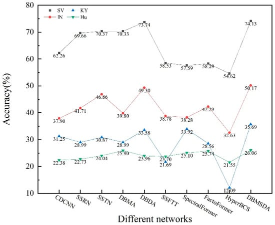 To demonstrate the classification performance of the DBMSDA network in extreme scenarios, such as with very limited sample data, we randomly selected approximately 10 pixels for each category from the KY, IN, and SV datasets as training pixels. Additionally, about 20 pixels for each category were selected from the Hu dataset as training pixels. We assessed the classification performance of the DBMSDA network and other networks using small sample data from these four datasets. The OA results for these datasets with small sample sizes are displayed in Figure 14.