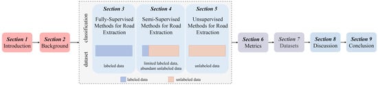 Integrating the advantages of the above reviews and analyzing their deficiencies, this review categorizes deep learning methods for road extraction from high-resolution remote sensing images based on the type of data annotation into fully supervised learning, semi-supervised learning, and unsupervised learning. Fully supervised methods are divided into six types based on network models: Patch-CNN, Encoder–Decoder, GAN, Graph, Transformer, and Mamba. Based on the different annotated data, semi-supervised methods are divided into less labeled data-based and weak labeled data-based methods. Unsupervised methods are divided into those based on the fewer parameters models and those based on large remote sensing models. Figure 1 illustrates the specific categorization of deep learning methods for road extraction in remote sensing images, and Figure 2 displays the organization of chapters in this review.