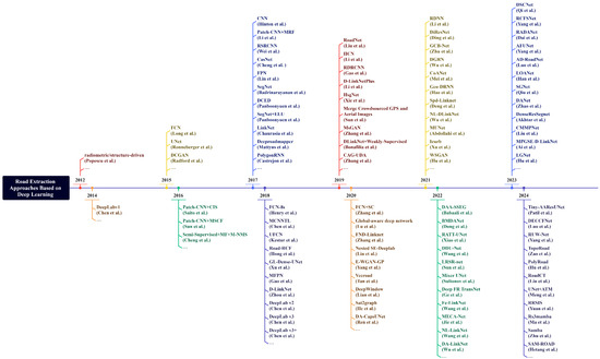 The development of road extraction has three main stages: morphological feature-based, manual feature-based, and deep learning approaches [117]. Initial traditional methods are often costly in terms of time and resources, and their reliance on manual analysis tends to restrict their accuracy [22]. As deep learning technology advances, methods that leverage it are progressively being refined, leading to ongoing improvements in both the precision and efficiency of road extraction. Therefore, this section focuses on the development of deep learning methods in the field of road extraction.