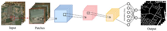 The process of road extraction from remote sensing images using a patch-based CNN model primarily involves several steps. Firstly, the image and segment are preprocessed into patches. Then, they are inputted into CNNs to extract features and identify the patches containing road information. Finally, the road patches are aggregated and the complete road network is outputted. Figure 5 illustrates the general architecture of a patch-based CNN model.