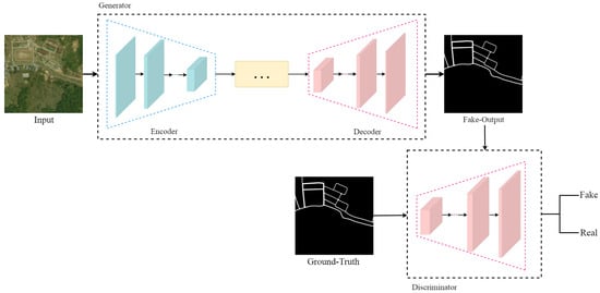 Recently, methods based on generative adversarial networks (GAN) have made significant progress in road extraction from remote sensing images. This strategy involves training a generator to produce realistic road images while simultaneously training a discriminator to distinguish between real road images and generated ones. The adversarial training process helps to enhance the accuracy and robustness of road extraction. Figure 7 illustrates the general architecture of the GAN model.