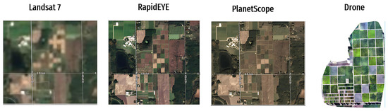 Images acquired in 2017 for the study site by Landsat 7 (8 August), RapidEye (9 August), PlanetScope (8 August), and UAV (11 August).