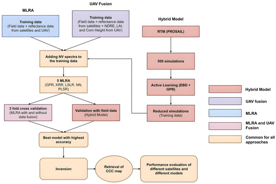 The flowchart illustrates the methods employed to derive the canopy chlorophyll content (CCC) across the study area. Note that MLRA stands for ‘machine learning regression algorithm’, which includes kernel ridge regression (KRR), least squares linear regression (LSLR), partial least squares regression (PLSR), Gaussian process regression (GPR), and neural networks (NN); NV signifies non-vegetated spectra.