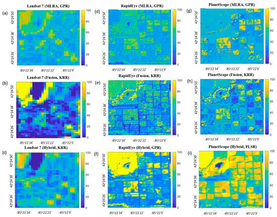 Canopy chlorophyl content (CCC) maps generated from (a–c) Landsat 7, (d–f) RapidEye, and (g–i) PlanetScope satellite images using the best-performing MLRA applied to satellite images, applied to fused UAV–satellite imagery, and integrated within the hybrid model (PROSAIL + MLRA) for each satellite dataset, respectively.