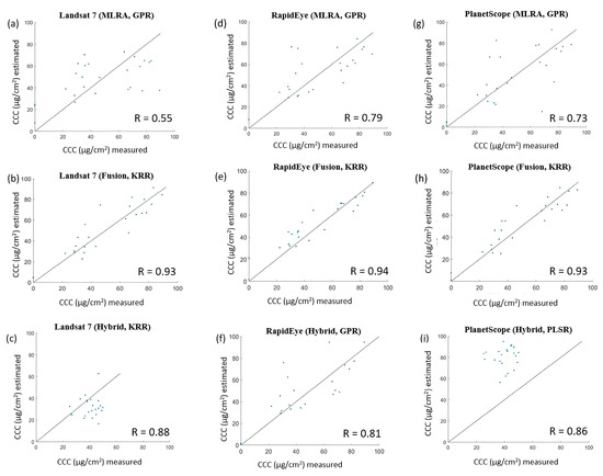 Relationship between measured and estimated canopy chlorophyll content (CCC) values for maps generated from (a–c) Landsat 7, (d–f) RapidEye, and (g–i) PlanetScope satellite images using the best-performing MLRA applied to satellite images, applied to fused UAV–satellite imagery, and integrated within the hybrid model (PROSAIL + MLRA) for each satellite dataset, respectively.
