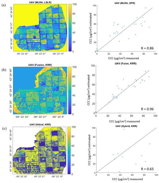 Canopy chlorophyl content (CCC) maps generated from (a) UAV image; (b) UAV image including UAV-derived NDRE, LAI, and canopy height model; (c) hybrid (PROSAIL + MLRA) model applied to UAV image—all using the best-performing MLRA for each scenario—followed by graphs showing the relationship between the measured and estimated CCC.