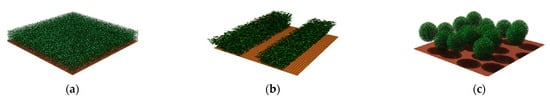 Whilst SAIL can be considered a turbid medium radiative transfer model, describing the canopy as a horizontally homogeneous series of randomly oriented scatterers (Figure 3a), rowSAIL and INFORM are hybrid radiative transfer models (Figure 3b,c).
