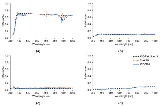 Reflectance of the white tarpaulin (a), grey tarpaulin (b), black tarpaulin (c), and artificial football field (d) between 350–1050 nm in the Valencia Anchor Station 2017 campaign, as determined from the airborne hyperspectral data using ATCOR-4 and FLAASH, and from in situ measurements of HCRF performed using the ASD FieldSpec 3 VNIR spectroradiometer. Note that several bands are excluded in the case of the white tarpaulin due to the saturation of the airborne hyperspectral data.