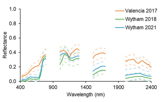 Over the ESUs, the atmospherically corrected airborne hyperspectral reflectance data demonstrated typical spectral characteristics associated with deciduous broadleaf forest in the Wytham Woods 2018 and 2021 campaigns, with the chlorophyll and water absorption features clearly identifiable at blue, red, and shortwave-infrared wavelengths, as well as a clearly defined red-edge and near-infrared shoulder (Figure 5). Whilst reflectance appeared slightly higher in 2021 than in 2018, it is worth noting that a different number of ESUs were sampled (Section 2.4), so a direct comparison between the mean reflectance spectra is not possible. In the Valencia Anchor Station 2017 campaign, the strong contribution of the soil background to the reflectance signal was apparent, particularly in the visible and near-infrared region, where the chlorophyll absorption features and red-edge were less apparent, and in the shortwave-infrared region, where reflectance was substantially higher than in the Wytham Woods 2018 and 2021 campaigns (Figure 5).