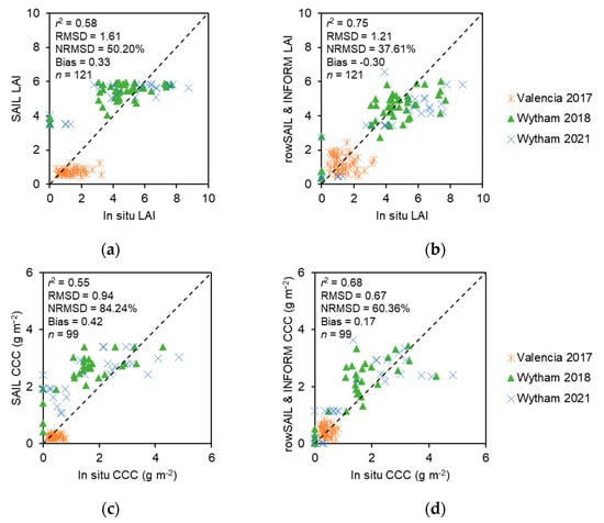 We hypothesised that CCC would be subject to worse retrieval accuracy than LAI, because as the product of two terms, there are more opportunities for errors to propagate. Our results support this hypothesis, with lower r2 and NRMSD values observed for CCC than for LAI retrievals (Figure 6c,d). In terms of the difference between the radiative transfer models, moderate performance was again provided by SAIL (r2 = 0.55, RMSD = 0.94 g m−2, NRMSD = 84%, bias = 0.42 g m−2) (Figure 6c), but as with LAI, an improvement in overall performance was offered by rowSAIL and INFORM (r2 = 0.68, RMSD = 0.67 g m−2, NRMSD = 60%, bias = 0.17 g m−2) (Figure 6d).