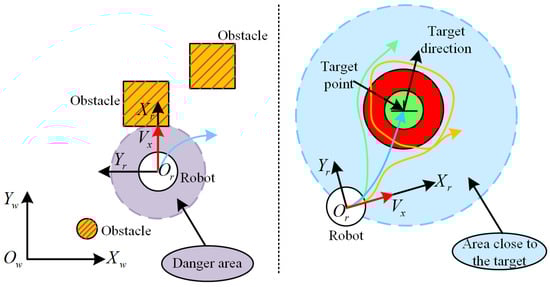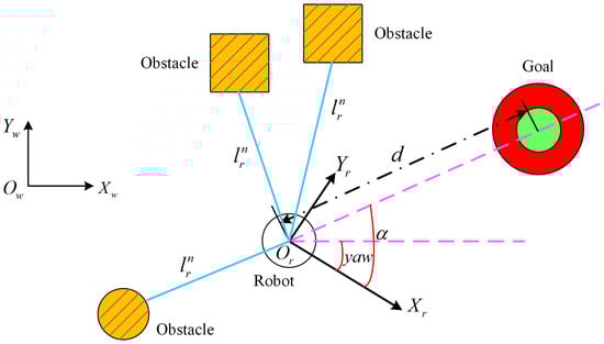 Considering the above, we use an analytic approach to quickly and accurately compute the optimal trajectory along which to reach the target point, allowing the experience replay pool to contain more successfully sampled data. In addition, utilizing actions close to the target to train the action policy results in a better way for the robot to reach the target point and in a better overall action effect of the agent, and it also improves the sampling efficiency of the training. When the robot is in a dangerous area, the robot is controlled to “extrication” using a fast path-generation algorithm, which is provided directly by the ROS (Robot Operating System) navigation package and is a fusion of the traditional A* and DWA algorithms [