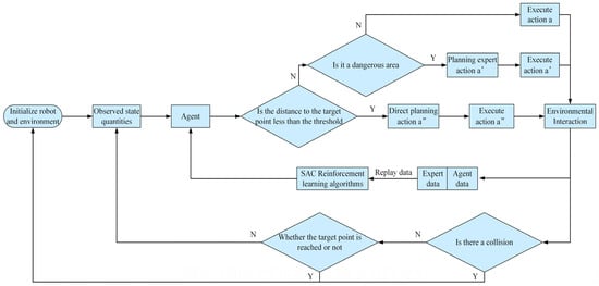 Although the addition of a safety layer to the SAC navigation policy improves the safety of the training process, the cost expectation estimated by the neural network may not be completely accurate and may be affected by hyperparameters during the training process, resulting in a situation where unsafe collisions can still occur during the training process. In order to improve the training speed and safety of the SAC algorithm, we made the following improvements: the first one was dividing the area where the robot is located, and when the robot was in the dangerous area, the fast path-generation algorithm was used to help the robot to “extrication”, and at the same time, the expert data generated by the algorithm were collected. The second was using the fast path-generation algorithm to intervene with the agent when the robot’s distance and angle deviation from the target point were within a set threshold, so the robot could reach the target point quickly and obtain a higher reward value. The data from both cases are used as expert data for additional training using imitation learning in addition to the SAC method.
