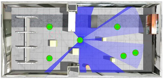 Figure 7, the simulation environment is built in Gazebo, and the size of the simulation environment is approximate to the size of the real environment in the laboratory, with a length and width of about 32 m and 16 m, respectively, and the maximum measurement depth of the robot-configured LiDAR is 20 m. The navigation target points for the test are randomly selected positions and directions in the six green areas in the figure, with position centers at