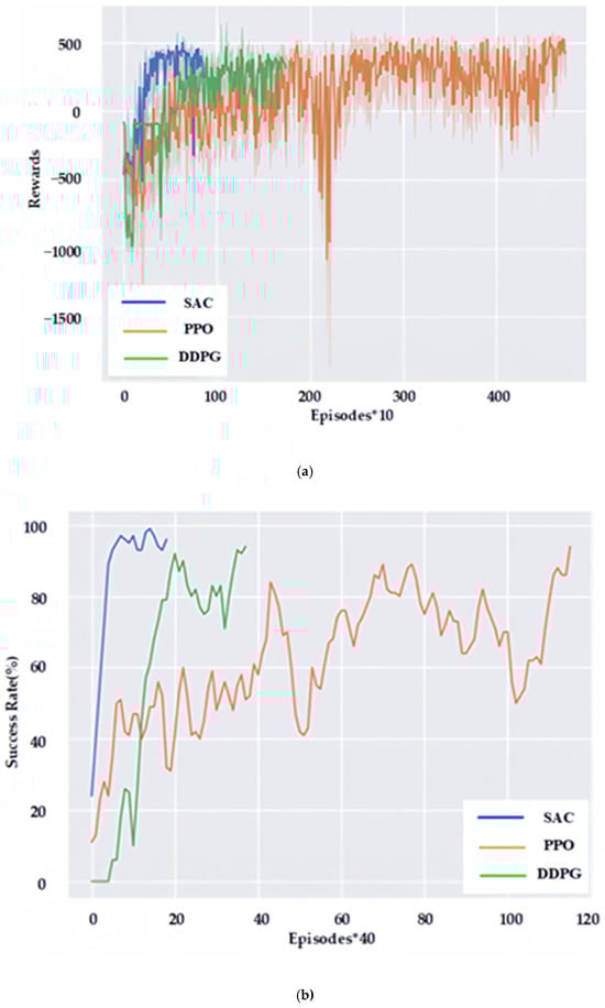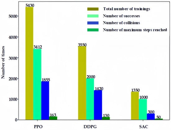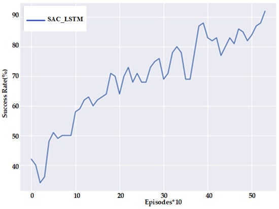 Figure 9, the SAC reinforcement-learning method proposed in this paper can achieve a success rate of more than 94% with fewer episodes, and at the same time requires fewer collisions, which is safer for training and conducive to application in practical environments.