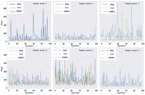 Figure 10 that both the offline-based DDPG and the SAC proposed in this paper have better navigation effects on the six test points after the training is completed. However, the SAC in this paper has the best effect, which can reach the target point with fewer steps and can go through a shorter path to reach the target point with the best effect. Compared to the first two methods, the online-based PPO reinforcement-learning method, which requires more steps to reach the target point, has the worst navigation effect. For example, on the first target point, the average number of steps needed to reach the target point by the PPO-based reinforcement-learning method is 107.59, while the average number of steps needed to reach the target point by the DDPG-based and SAC-based reinforcement-learning methods proposed in this paper are only 40.52 and 32.78, respectively.