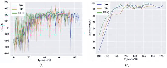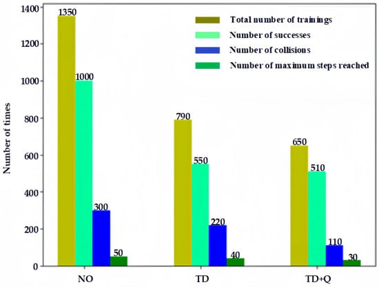 Figure 12, when no expert data are introduced (NO), 887 episodes are needed to achieve a 96% navigation success rate, and 772 episodes are needed to achieve a 95% navigation success rate by introducing imitation learning and a time-differential error (TD)-based replay technique. However, in this paper, the introduction of imitation learning and improved prioritization of the experience replay technique (TD+Q) can achieve a 98% success rate with only 701 episodes. What is more, the number of robot collisions can be further reduced from 305 to 224 and 113, respectively, after the introduction of imitation learning, thus making the training safer.