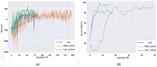 Figure 14, the PPO_LSTM method can also obtain a better navigation success rate after the introduction of Recurrent Neural Networks, but its training efficiency and navigation success rate are lower than the SAC_LSTM method proposed in this paper due to its use of an online approach to agent training and lack of stochastic exploration.