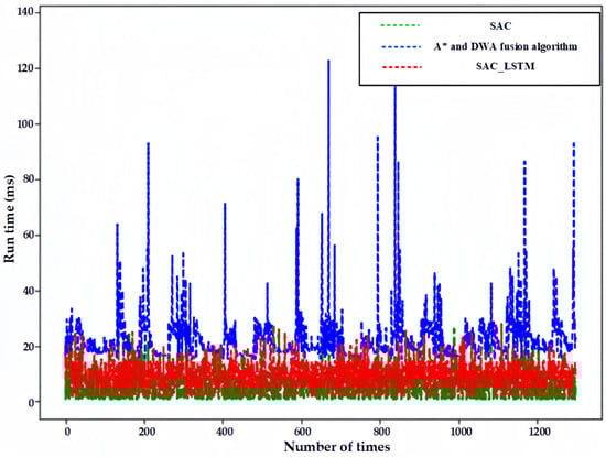 Figure 19, the average computation time of the fast path-generation algorithm (A* and DWA fusion algorithm) for calculating speed control commands is 23.527 ms, and the average computation time of the reinforcement-learning method without a Recurrent Neural Network (SAC) is 6.378 ms, and after the introduction of the Recurrent Neural Network (SAC_LSTM), the network parameters involved in computation are more, resulting in a slight increase in computation time to 9.557 ms. However, this is significantly lower than that of the traditional navigation algorithm, which is only 40.62%.
