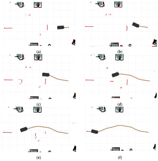 Figure 20b,c; then, after passing through static obstacles, the robot senses dynamic obstacles and generates an obstacle-avoidance trajectory, as shown in