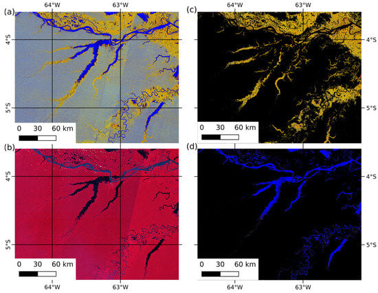 (a) ALOS-2 PALSAR-2 ScanSAR false colour composite (HH, HV, NPDI: Normalised Difference Polarisation Index) acquired between 12 and 25 August 2019; (b) reference optical Landsat 8 and Sentinel-2 false colour composite (NIR, Red, Green). Example area defined as (c) inundated forest, and (d) open water through visual interpretation of the ALOS-2 PALSAR-2 ScanSAR data. Images centre on the Coari region of the Amazon Basin.
