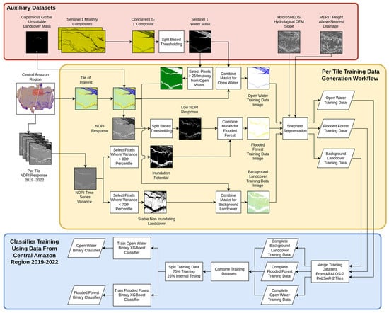 Training data for each class is developed on a per 1 × 1 degree tile basis, for all tiles available over the central Amazon region between 2019 and 2022 (1794 tiles in total) covering a range of hydrological conditions. This comprehensive training dataset ensures that the subsequent classifier is capable of detecting inundation at any time of year within any part of the basin.
