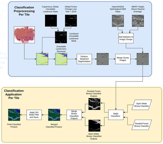 Training data was generated for two binary classifiers. One classifier was trained for the detection of Inundated Forest vs all other landcovers, and a second classifier was trained to map Open Water vs all other landcovers. This approach was adopted following [24], which demonstrated improved classification accuracy compared to a more complex multi-class classification system when applied to Sentinel-1 C-band imagery for classification of open water, inundated herbaceous vegetation, and background dry land in Western Zambia. Figure 3 provides a summary of the workflow for generating the training data as well as an overview of how this is used to train the two classifiers. Figure 4 shows the preparation of ALOS-2 PALSAR-2 tiles and the subsequent application of the trained classifiers. Details of the training and classification procedures are provided in the sections below.