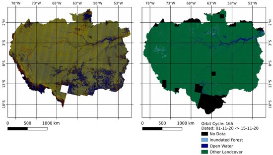 Several previous studies have used L-band SAR for mapping inundated forests within the Amazon River Basin, including those using the systems JERS-1 SAR [10,11,28,34], ALOS PALSAR [12,29,30,31,32,33], and ALOS-2 PALSAR-2 [9,35]. These studies have produced inundation maps at various temporal and spatial scales. Attempts to map the entire Amazon River Basin have produced annual dual-season inundation maps [9,10,11,28]. These products typically capture the broader temporal scale inundation characteristics (dry and wet season inundation extents). Chapman et al. [12] also examined inundation dynamics on an intra-annual basis but this was limited to particularly sub-catchments in the Amazon River Basin over a relatively short time period, considering observations made on six dates between January and August 2007. Intra-annual dynamics have been shown to be important in other large wetland systems where spatial and temporal dynamics have been linked to global scale circulation patterns [4], enabling delineation of areas vulnerable to drought or flood [24]. To date, there are no high-frequency maps (multiple observations per year) of inundation for the Amazon at the basin scale.