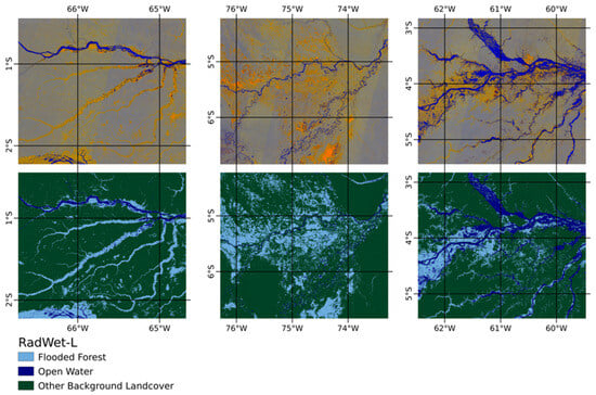 Many widely used global wetland databases and maps (including the Global Lakes and Wetlands Database and the Global Surface Water system) do not adequately capture the extent of inundation vegetation [4]. RadWet-L is designed to detect both open water and inundated forest. The contribution of inundated forest to the total inundation extent of the Amazon Basin is considerable, representing an estimated 9.5% of inundation in the dry season, and 74% of the total observed inundated during the wet season. This proportion of inundated forest detected by RadWet-L for the Amazon Basin is similar to the proportions of inundation vegetation reported in other studies focussing on herbaceous-dominated tropical wetland landscapes using C-band radar, including Western Zambia [24,25] and the Upper Rupununi, Guyana. If tropical wetland inundation is to be mapped, inundated herbaceous vegetation must also be taken into account. Future work should consider harmonising information from L- and C-band radar to map both inundated forest and inundation herbaceous vegetation, working towards a comprehensive inundation mapping system to provide accurate inventories of the world’s tropical wetlands.