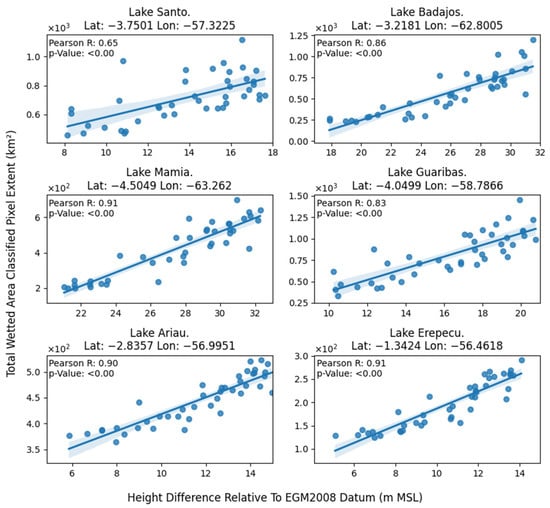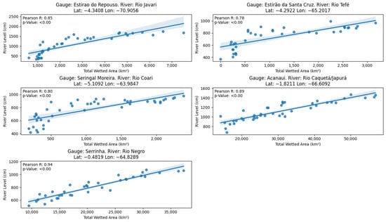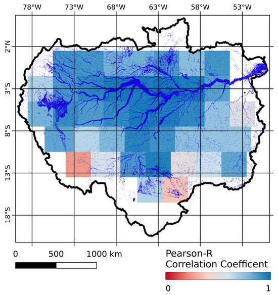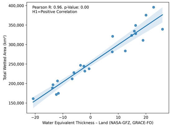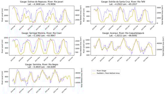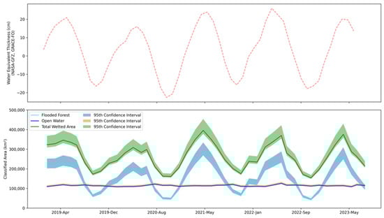 An Amazon Basin-wide comparison was made between RadWet-L classified total wetted area for each ALOS-2 PALSAR-2 orbit cycle and the NASA-GFZ Gravity Recovery and Climate Experiment Follow-On (GRACE-FO) Gravity Mass Anomaly Dataset [57]. Changes in gravity anomaly are strongly controlled by changes in terrestrial water storage, measured as water equivalent thickness [57]. Although these data are provided at a coarse spatial scale (native resolution of 3° × 3°), mass anomaly measurements and water equivalent thickness are calculated as a monthly product for the entire basin region.