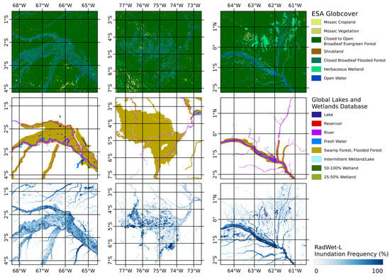 Comparison between ESA GlobCover [63] (top), the Global Lakes and Wetlands Database [61,62] (centre), and RadWet-L Inundation Frequency (2019–2023) (bottom).