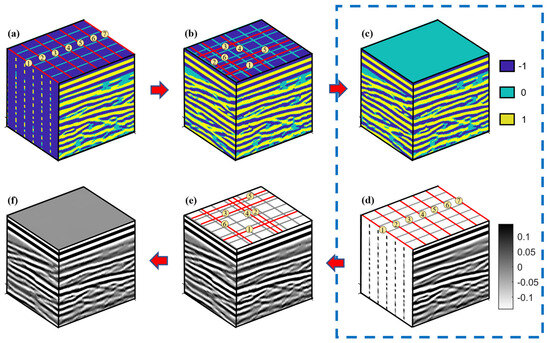 where represents the categorical data, represents the original data, and is a chosen threshold value that determines the cutoff between what are deemed to be significant positive or negative amplitudes and near-zero amplitudes. Through extensive testing, we have found that setting between the 15th and 25th percentiles of the observed absolute amplitudes in the dataset tends to produce the best results with our methodology [33], as it allows for the reflection trends to be most clearly highlighted in the categorical image. Determination of the most appropriate value of within this range, however, should be done via visual inspection. Once the low-resolution categorical dataset has been defined, 2D QS simulations are begun in order to gradually complete the information between the survey lines and generate a high-resolution categorical volume. To this end, we begin by simulating a small number of profiles in the across-line direction (Figure 2a), which serve as “tie-in points” for subsequent along-line simulations and help to ensure continuity in the results obtained. For these simulations, the TI can either be derived from existing lines in the same direction, if they are available, or, if local isotropy of the structures can be assumed, from the along-line profiles. Next, we alternate between simulating randomly selected along-line and across-line categorical profiles, treating the results obtained as conditioning data for the next simulations (Figure 2b). This process is carried out until a complete high-resolution 3D categorical volume is generated (Figure 2c). The latter is then paired with the low-resolution continuous GPR measurements to help constrain and guide the continuous QS simulations towards realistic structures. These simulations are carried out in a similar manner to the categorical ones, first along a small number of across-line profiles at regular intervals (Figure 2d), followed by alternating between randomly selected along-line and across-line profiles (Figure 2e). Finally, a single realization of the high-resolution densified data cube is obtained (Figure 2f).