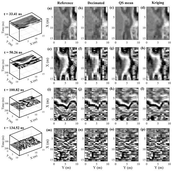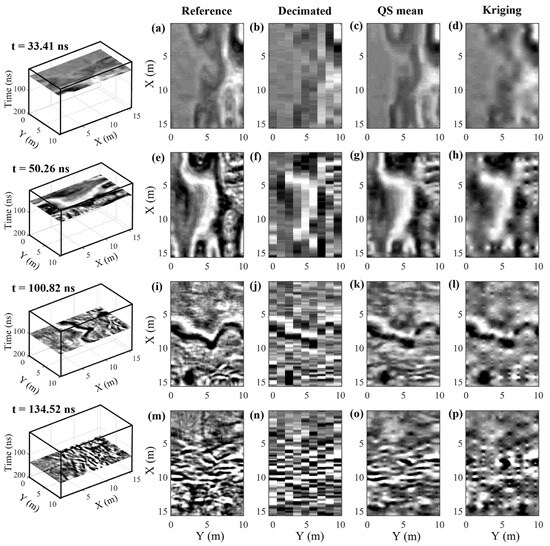 (a,e,i,m) High-resolution time slices from the Herten data cube presented in Figure 3 at t = 33.41 ns, 50.26 ns, 100.82 ns, and 134.52 ns, respectively. The positions of the profiles in the cube are shown in the left column, and the spatial sampling interval is equal to 0.1 m in both directions. (b,f,j,n) Corresponding decimated time slices, where the spatial sampling in the across-line (Y) direction has been reduced to 0.8 m. (c,g,k,o) Corresponding time slices from the reconstructed data cube, obtained via the mean of 10 stochastic QS realizations, where the reconstructed spatial sampling interval is 0.1 m in both directions. (d,h,l,p) Corresponding time slices from the reconstructed data cube obtained via kriging interpolation along the time slices.