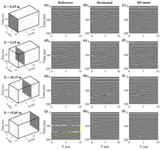 Figure 5, Figure 6 and Figure 7 display the reconstruction results obtained for the decimated Herten dataset with an across-line measurement spacing of 0.8 m. In Figure 5, we examine the results for four selected across-line profiles, which are located at along-line positions of X = 0.25 m, 5.15 m, 10.15 m, and 15.65 m. The locations of these lines in the data cube are shown on the left, whereas the left, center, and right columns of the adjacent matrix display the original high-resolution data, the low-resolution decimated data, and the pixel-wise mean of 10 stochastic QS realizations, respectively. We see that when decimating the data by keeping only one of every eight traces, strong spatial aliasing is introduced. Indeed, many steeply dipping features such as diffraction tails seem to disappear, and the decimated across-line profiles show only a faint resemblance to the originals. In the reconstructed results, we observe that our proposed algorithm has done an impressive job of recovering most of the key reflection patterns. For instance, the strong, undulating reflection in the upper part of the domain from 30–70 ns, which is often difficult to follow in the decimated results, is accurately recovered in all four selected profiles. The same is true for two other variable reflecting interfaces located around 100 ns and 150 ns. There are some smaller-scale features in the original dataset, however, that our approach was not able to recover due to a complete lack of coherence of these features in the decimated dataset. Examples include the numerous diffraction hyperbolae appearing in Figure 5j between 100 and 150 ns, highlighted by the yellow box, and the deeper diffraction hyperbola occurring between 150 and 200 ns at a position of approximately y = 7.5 m in Figure 5a, outlined with the green box. Indeed, parts of these features remaining in the decimated dataset were reconstructed as shallowly dipping reflecting interfaces, which are predominant in the three across-line TIs shown in Figure 4.
