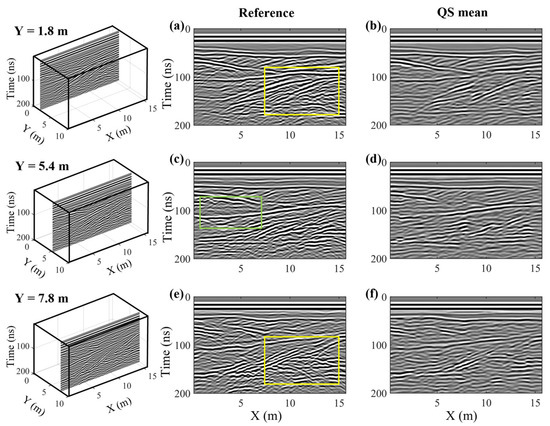 Figure 14 presents the BHRS reconstruction results for three selected along-line profiles, which are located mid-way between survey lines in the decimated dataset at across-line positions of Y = 1.2 m, 9.2 m, and 17.2 m. Similar to what was observed in Figure 13, all of the QS estimates can be seen to display a close match with the high-resolution reference profiles. For example, the dipping reflections at various angles in the left part of the three profiles, between approximately 60 and 120 ns, have been successfully captured, and larger diffraction hyperbolae, such as those present below 120 ns, are also well modeled. Again, however, some zones containing multiple superimposed small-scale diffraction features, as highlighted by the yellow and green boxes in Figure 14e, are laterally smoothed in the reconstruction results.