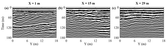 For this reconstruction test, survey lines were regularly removed from the BHRS volume, leading to an across-line measurement spacing of 0.8 m. This represents the deletion of 87.5% of the total number of traces. The time required to generate one QS-based realization was approximately 2.7 h on the same workstation described previously, whereas kriging along time slices required 2.4 h. Similar to the Herten example, three GPR profiles in the across-line direction were also considered TIs for the QS simulations in that direction. These are located at along-line positions of X = 1 m, X = 15 m, and X = 29 m and presented in Figure 12. For both the categorical and continuous amplitude BHRS reconstructions, our initial value of was found to provide a good replication of the structural reflection patterns and amplitude characteristics of the TIs. Parameters and were set to 1.1 and 0.02, respectively, which are the same values used with the Herten dataset.