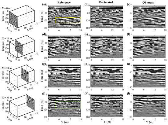 Figure 13 shows the BHRS reconstruction results for four selected across-line profiles, located at along-line positions of X = 0 m, 10 m, 20 m, and 30 m. The decimated images, particularly the dipping reflections in the upper part of Figure 13b, are strongly spatially aliased, but much of this is resolved in the corresponding QS estimates (e.g., Figure 13c). Indeed, most of the QS results show an excellent match with the reference profiles, with the exception of some zones containing multiple small-scale diffraction hyperbolae, for instance around 130 ns in Figure 13a, as highlighted by the yellow box, and between 60 and 120 ns in Figure 13j, as highlighted by the green box, which become more laterally smoothed in the corresponding reconstructions in Figure 13c,l. Again, the latter results in part from the fact that the presented QS reconstructions represent the mean of 10 stochastic realizations rather than a single realization of our 3D reconstruction procedure, which has the tendency to smooth features in zones that are less well constrained by the available data.