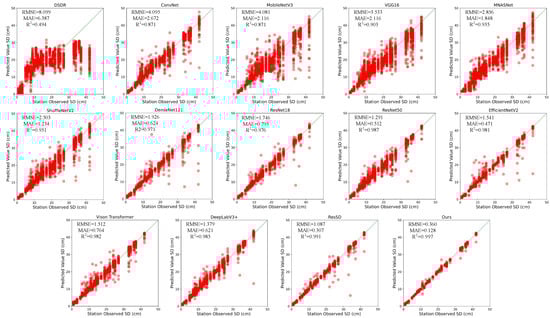- Proposing a multi-scale neural network: Unlike ‘point-to-point’ predictions ignore spatial characteristics, our model is an ‘area-to-point’ snow depth estimation deep model. The proposed network comprises a multi-branch feature extraction unit (MBFE), a multi-scale feature atrous aggregation module (MSFAA), and a high- and low-level feature fusion module (HLF). These components endow the new model with multi-scale feature perception capabilities, which is particularly advantageous in reducing non-snow area spatial interference, thereby achieving high accuracy snow depth estimation.