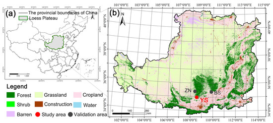 Location of the study area. (a) The position of the Loess Plateau; (b) The locations of Yongshou (YS), Zhengning (ZN), and Baishui (BS).