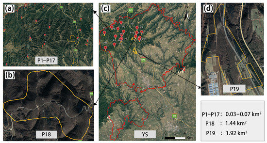 Distribution of UAV multispectral sample plots: (a) distribution of scattered small plots; (b) distribution of large-block plots; (c) distribution of plots in YS County; and (d) distribution of large-block plot distribution. “P” represents “plot”.