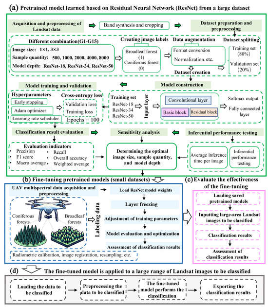 The framework for identifying broadleaf and coniferous forests using Residual Neural Network (ResNet) architecture and transfer learning techniques: (a) pre-trained model; (b) fine-tuning the pre-trained model; (c) evaluation of the effectiveness of the fine-tuning; and (d) model application.