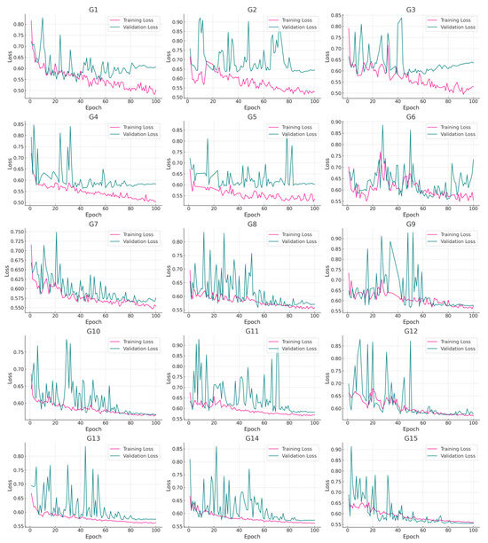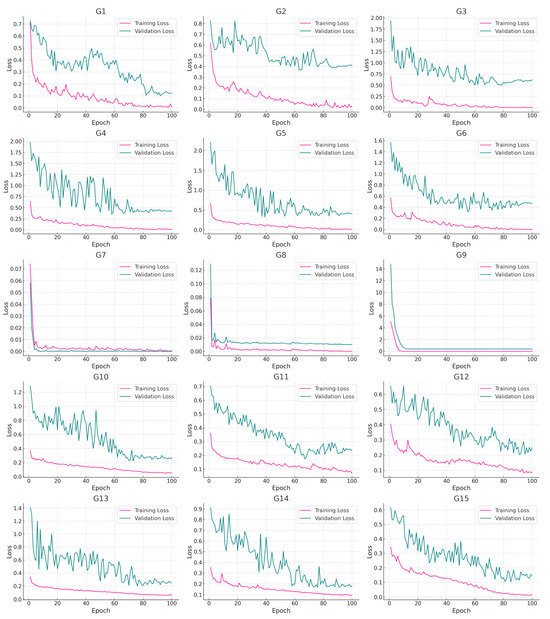 The results shown in Figure 6 reveal that within the 1 × 1 image configuration, the majority of combination strategies (G7–G15) exhibit a decline in both training and validation loss curves as the epoch count increases. Notably, the rate of decrease in training loss generally surpasses that of validation loss, indicating the model’s ability to learn effectively from the training data. However, certain combination strategies (G1–G6) display either fluctuating trends or a minor upward trend in their validation loss-curves. Conversely, under the 3 × 3 image configuration depicted in Figure 7, the loss curves display more uniform fluctuations and a more consistent downward trend, particularly with respect to the training loss. This suggests that the model exhibits enhanced generalization capabilities and a reduced likelihood of overfitting when processing information across a broader context. Further examination of the 1 × 1 image configuration shows that the validation loss-curves tend to stabilize with increasing sample size, underscoring the beneficial impacts of appropriate sample sizes on the model’s generalization ability. Additionally, the selection of model depth substantially affects the loss curves’ dynamics and the model’s ability to mitigate overfitting, highlighting effective adaptive strategies for various model depths. In contrast, for the 3 × 3 image configuration, a moderate sample size of 2000 (G7–G9) leads to a markedly consistent decline and minimal volatility in the model’s loss curves, demonstrating improved generalization performance in this specific setup.
