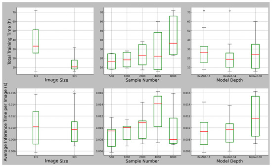 Figure 8 reveals how image size, sample quantity, and model depth impact both the overall training time and average inference time per image for ResNet models. When comparing total training times, it is evident that using an image size of 1 × 1 extends training significantly, compared to use of 3 × 3, suggesting minimal gains in computational efficiency from reducing image size. There was a noticeable escalation in training time which occurred as the sample quantity grew, particularly from 500 to 2000 samples, with the rate of increase becoming more moderate between 4000 and 8000 samples. Model depth also played a role in training time, with ResNet-50 requiring much longer training periods than both ResNet-18 and ResNet-34. Remarkably, ResNet-34 achieved the shortest overall training time, indicating that a network of moderate complexity can offer substantial time savings. With respect to the average inference time per image, the trend was similar to that of the overall training times, showing that 3 × 3 images are processed more efficiently during inference than are their 1 × 1 counterparts. Apart from the highest sample quantity of 8000, an increase in sample quantity led to a notable rise in inference time, suggesting that efficiently processing diverse dataset sizes is feasible once the model is adequately trained. Nevertheless, as the model depth increased, so did inference time, particularly with ResNet-50, underscoring the increased computational demands of deeper models during inference. To summarize, image size, sample quantity, and model depth substantially shape the computational efficiency of models.
