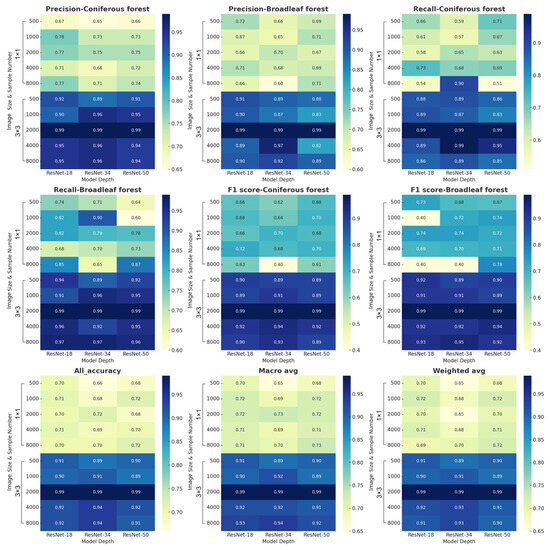 Overall, the image size substantially impacts model accuracy. Specifically, increasing the image size from 1 × 1 to 3 × 3 enhances performance across most combinations of sample sizes and model depths. This result indicates that appropriate images offer more contextual information, which aids in the model’s feature-recognition capabilities across different forest types. Furthermore, the number of training samples plays a crucial role in the model’s classification accuracy. As training samples increase, so does accuracy in distinguishing between the two types of forests. This trend is especially evident at sample sizes of 2000, 4000, and 8000, emphasizing the need for substantial training data to improve model generalization. Additionally, the analysis of model depth reveals that, in scenarios with smaller images (1 × 1) and fewer samples, simpler models like ResNet-18 can sometimes outperform deeper models such as ResNet-50. However, as image sizes and sample quantity grow, the advanced feature extraction and representation capabilities of deeper models generally yield better performance.