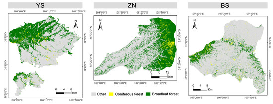 The Loess Plateau, one of China’s key ecologically vulnerable zones, has historically been faced with severe environmental challenges, including soil erosion, vegetation degradation, and desertification, due to its long-term irrational land use, water scarcity, and harsh terrain and climatic conditions [5,6]. To address these problems, the Chinese government has undertaken several ecological restoration initiatives since the 1990s, most notably, large-scale tree planting and afforestation efforts which have substantially expanded the artificial forest cover on the Loess Plateau. Among these, coniferous and broadleaf forests, mostly artificial, have become the primary forest types in the region. They play a crucial role in preventing wind and sand fixation effects, improving soil quality, and conserving biodiversity [7,8,9]. In the face of escalating climate change and human activities, rapid and accurate identification and monitoring of these forest types is crucial for ecological restoration and sustainable management on the Loess Plateau.