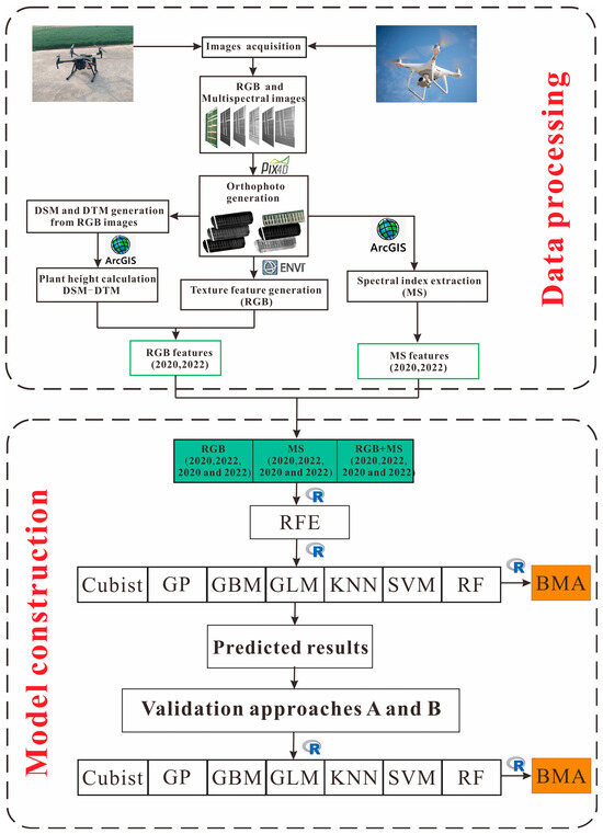 Figure 2 illustrates the data acquisition process. In this study, the UAV captured MS and RGB images during the flowering period, which were subsequently imported into the software (version 4.0.8) (Shenzhen DJI Technology Co., Ltd., Shenzhen, China) for image alignment and processing. The software first generated a sparse point cloud of the flight area based on the UAV images and position data. This sparse point cloud was used to create a spatial grid of the flight area and integrate ground control points (GCPs) to provide accurate spatial coordinate information. This approach resulted in sparse point clouds with precise locations as well as information about the surface geometry and spatial texture of the flight area. The MS images were calibrated using known reflectance to convert the DN values to reflectance. The processed data were then used to create a high-resolution digital orthophotos map (DOM), digital surface models (DSM) and digital terrain models (DTM) of the flight area. Finally, the processed images were exported in TIFF image format. ArcMap 10.5 software (Environmental Systems Research Institute, Inc., Redlands, CA, USA) was then used to divide the MS HD digital orthophotos into plots, generating corresponding shapefile files for 180 separate areas with unique IDs. For each region, the spectral reflectance information of the corresponding ID region was identified and extracted. To reduce the influence of edge effects on the image, the shapefile was created by excluding the image edge regions. Using the raster calculator function, we performed DSM–DTM calculations to obtain plant height information from the digital surface model. In addition, the cropped RGB images were imported into ENVI software (version 5.3) (Exelis Visual Information Solutions, Inc., Boulder, CO, USA) to extract texture features. The window size for texture extraction was 7 × 7. These features included mean (ME), variance (VA), homogeneity (HO), contrast (CO), dissimilarity (DI), entropy (EN), second moment (SE) and correlation (COR). All means were extracted according to each ID and used as features of the corresponding region.