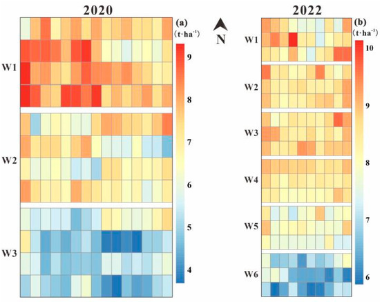 Figure 3 shows the winter wheat yields for all plots in 2020 and 2022. In 2020, the average yield for winter wheat was 6.55 t·ha−1. Among the three water treatments, the yields followed a descending order: W1 > W2 > W3. The W1 treatment achieved the highest yield at 10.44 t·ha−1. In 2022, the average yield for winter wheat increased to 8.21 t·ha−1. The pattern across the six water treatments was W1 > W2 > W3 > W4 > W5 > W6. The W6 treatment recorded the lowest yield at 5.63 t·ha−1. This trend supports the hypothesis that increased irrigation correlates with higher yields. The yield data for the plots exhibited clear color distributions, emphasizing notable differences between the treatments. Additionally, there was a distinct separation observed within the datasets.